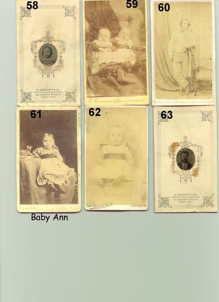 58, 61 & 63 – Charles Wherrett senior 83 Elizabeth St 1872 – 1881 his son Charles Wherrett with various others at various locations in Hobart 1884 – 1897. W Burrows and Co was W.H. Burrrows at Wherretts; Melbourne & Sydney Portrait Rooms, Launceston 1878 -1895. Duval and Co with Burrows 1888 – 1900