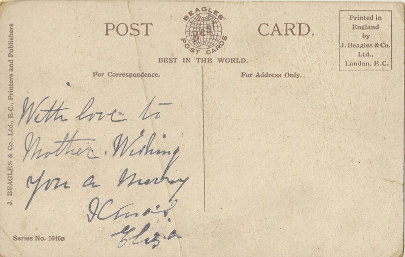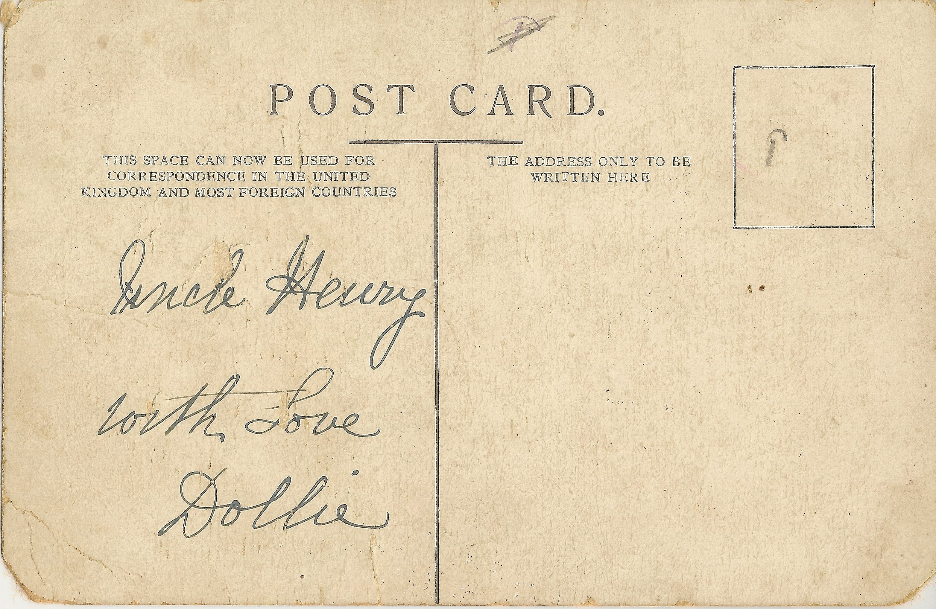 Post card from niece Clara ‘Dolly’ Holt (Diprose) to her Uncle Henry. I love Aunt Dolly’s intention in sending this particular card to her Uncle Henry……. Twickenham being the region where Henry’s parents (Wells and Collis families) were from……..