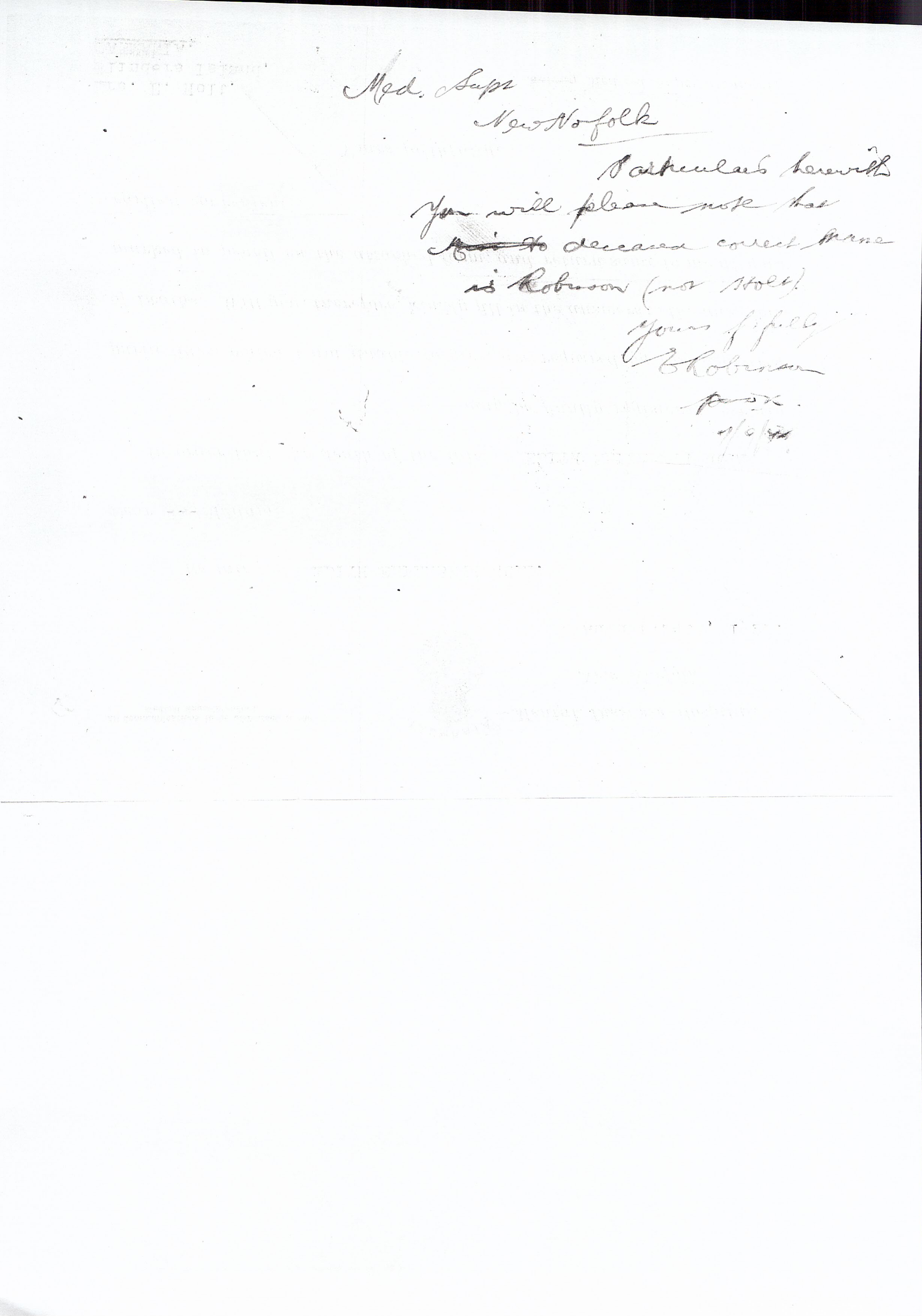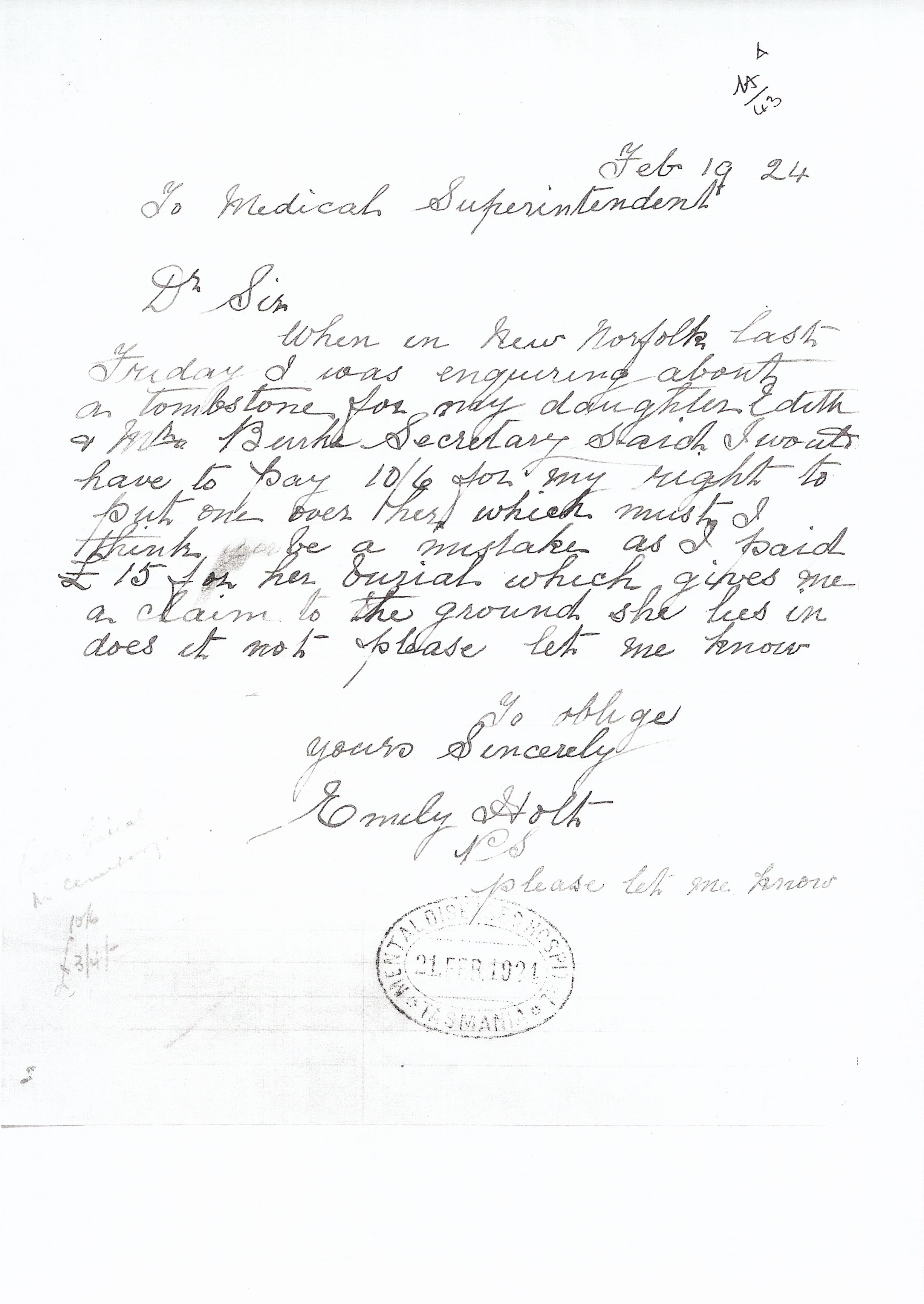 23 August Emily writes ‘Dr Sir, Just a few lines to send you all my sincere thanks for the great kindness shown to my dear daughter Edith Holt & to let you know how I regret not being able to come and see the last of my dear girl but I have been months in bed with Neurotic rheumatism & now my husband being up in years is very ill & I could not possibly leave him my kind respects. I remain your Sincerely Emily Holt. P.S enclosing cheque as requested for fifteen pounds one shilling.